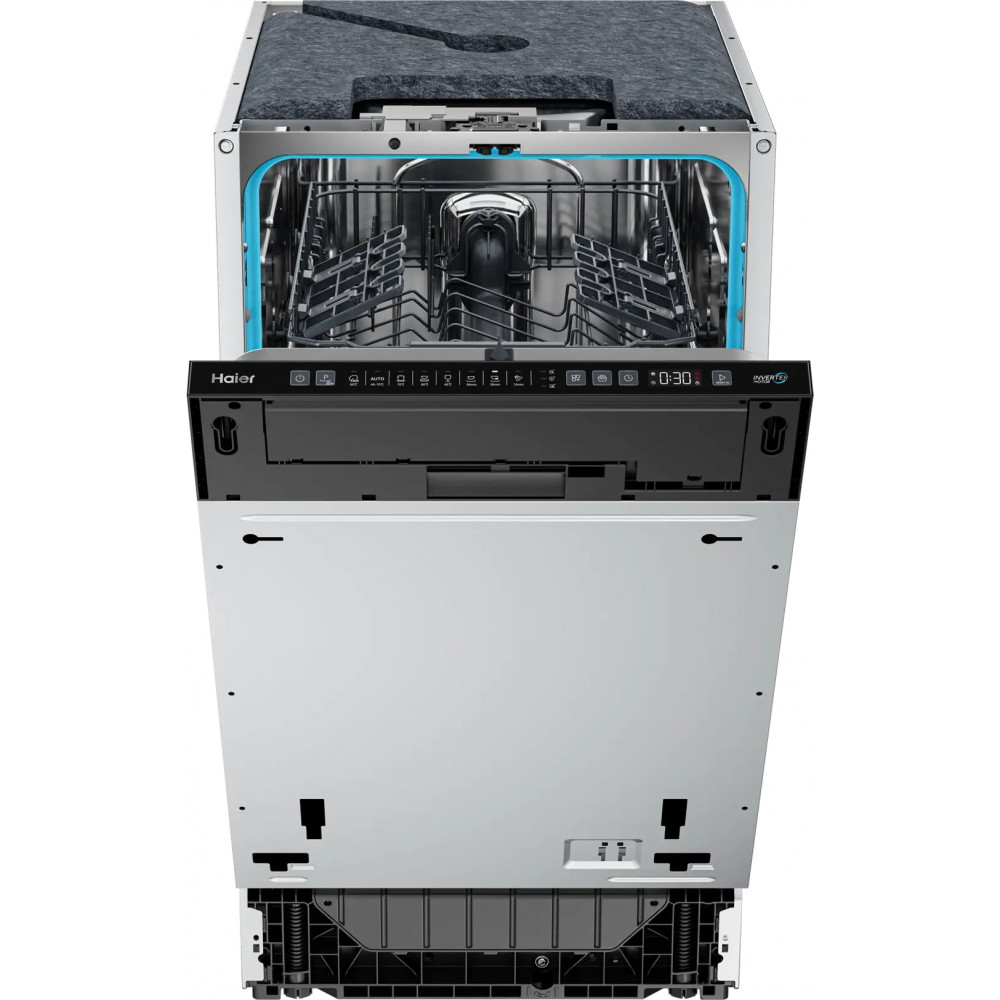 Посудомоечная машина Haier HDWE10-593RU — это узкая модель, шириной 45 см, но весьма вместительная. За раз она может вымыть сразу много посуды, до 10 комплектов — это оценят в больших семьях, а также те, кто любит готовить, часто принимает гостей. Важная особенность этой модели — автоматическое открывание двери в конце программы мойки. Так посуда высохнет более быстро и качественно без дополнительного расхода электроэнергии. Кроме того, данная модель предусматривает элементы дополнительной гигиены и безопасности: специальное антибактериальное покрытие эффективнее предотвращает размножение бактерий и грибков, а шланг AquaStop делает защиту от протечек еще более надежной.